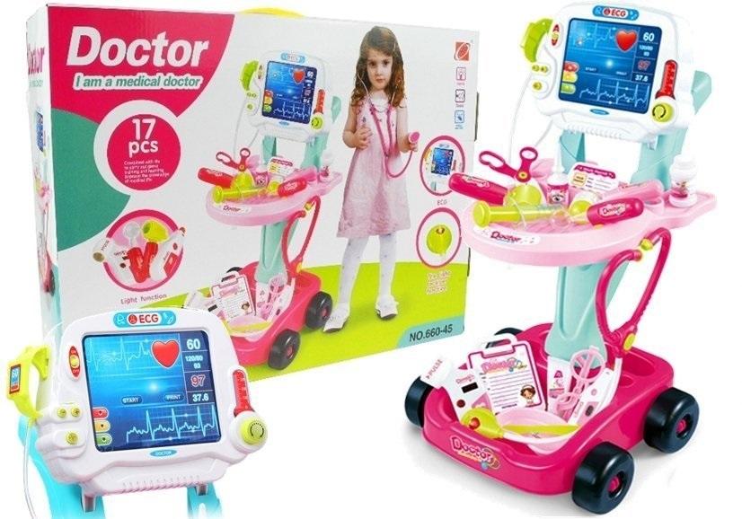Zestaw Lekarski na Wózku Lekarz EKG 17 Elementów Bogato wyposażony zestaw lekarski. Idealny dla małych miłośników zabawy w lekarza. Stabilny wózek na czterech kółkach z rączką, dwoma półeczkami na przedmioty lekarskie i tablicą. EKG sprawdzi się idealnie dla przyszłych, małych lekarzy. Zestaw zawiera wiele niezbędnych przedmiotów związanych z zawodem lekarza, m.in: - panel / wózek do EEG z możliwością przenoszenia lub przewożenia na kółeczkach (zasilany 2 bateriami typu AA - brak w zestawie) - okulary - stetoskop ze świecącym serduszkiem wydający dźwięk bijącego serca - termometr z możliwością regulacji temperatury i podświetlanym wynikiem - otoskop laryngologiczny z lampką, idealny do badania uszu pacjenta - ciśnieniomierz z regulowanym i podświetlanym wynikiem - młotek - strzykawka - lusterko dentystyczne z lampką - dwie pary nożyczek chirurgicznych - skalpel - basen - imitacja kremu do dezynfekcji rąk - imitacja kropli do oczu - imitacja pojemniczka z lekami - plakietka z nazwiskiem doktora - karta pacjenta Wymiary złożonego wózka: 58 cm x 41 cm x 32 cm Zabawka przeznaczona dla dzieci powyżej 3. roku życia. Wymiary opakowania: 48 cm x 37.5 cm x 12 cm