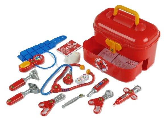 Zestaw lekarski w kuferku z szufladą jest jednym z najbogatszych w serii. Zawiera on kompletne, niezbędne wyposażenie każdego medyka. Czerwony kuferek wykonany jest z bardzo trwałego tworzywa, posiada wygodny uchwyt do noszenia oraz żółty klips, który zabezpiecza ją przed otwieraniem się. Kuferek jest dwukomorowy, a cały zestaw zawiera aż 14 elementów. Oprócz standardowych przyrządów jak stetoskop, otoskop, termometr czy strzykawka, zawiera także ciśnieniomierz nadgarstkowy z dźwiękiem. Wszystkie elementy są oczywiście bezpieczne dla dzieci i proste w użyciu. Dzięki dużej pojemności i dostępności dwóch komór kuferka, dziecko może wzbogacić swój zestaw o np. bandaże, kompresy czy inny ekwipunek, który uzna za niezbędny. Standardowo kuferek zawiera plastikowy stetoskop, zabawkowy ciśnieniomierz z dźwiękiem (wymaga użycia baterii, których brak w zestawie), strzykawkę, termometr, otoskop, młoteczek, nożyczki, szczypce, plaster, pensetę, pudełeczko na watę, kartę pomiarów medycznych. Wszystkie elementy są oczywiście bezpieczne dla dzieci i proste w użyciu. Seria zestawów i akcesoriów lekarskich z jednej strony służy zabawie w doktora czy pielęgniarkę, a z drugiej strony pomaga dzieciom oswoić się z tematem wizyty u lekarza, wykonywanych badań i zabiegów. Mamy tutaj szeroki wybór zestawów z większą lub mniejszą ilością akcesoriów oraz szereg pojedynczych produktów jak np. fartuchy lekarskie czy stetoskopy. Cała seria wizualnie stworzona jest tak, aby mogli się nią bawić zarówno chłopcy jak i dziewczynki.