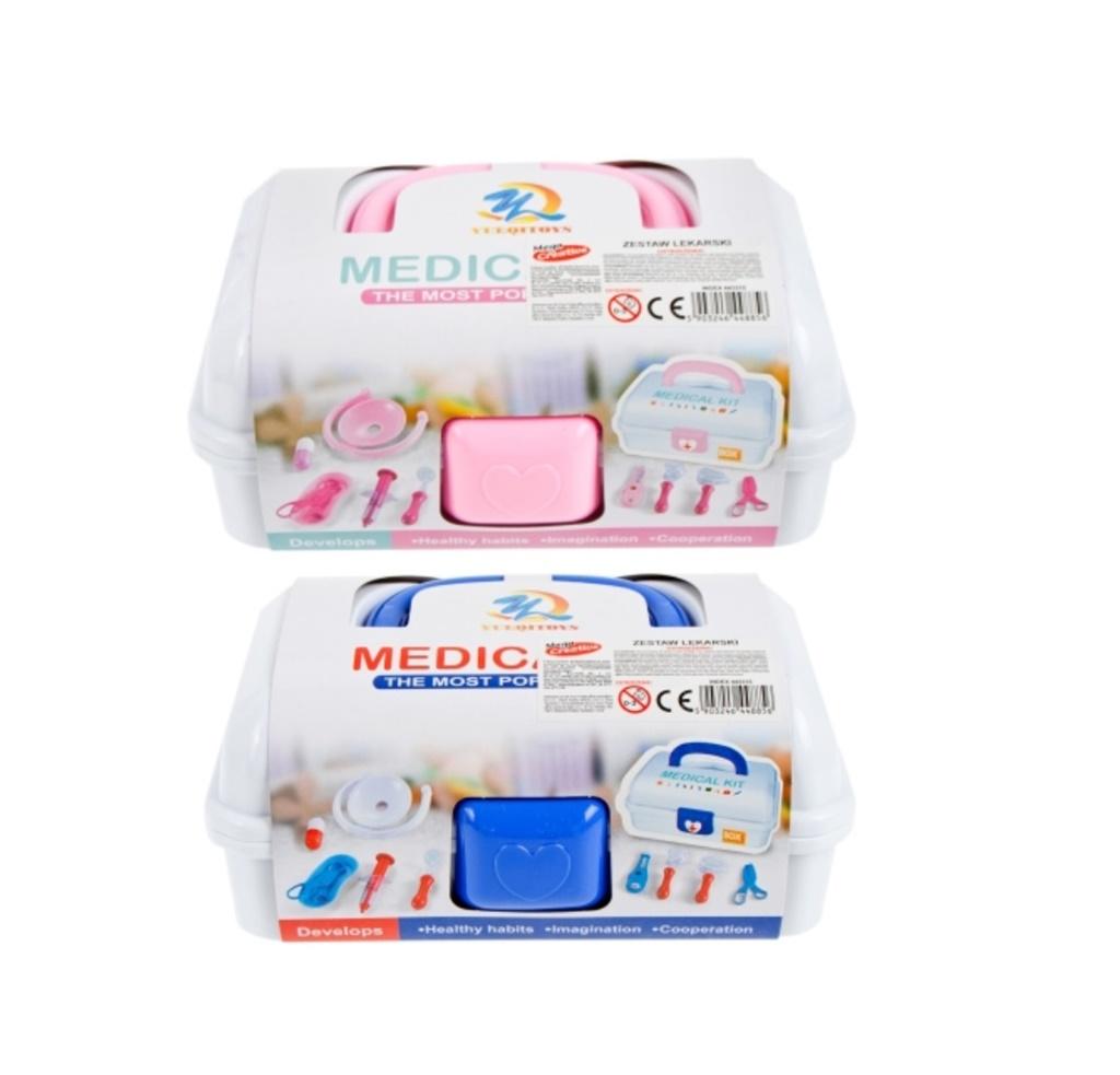 Wieloelementowy zestaw małego lekarza dostępny w dwóch kolorach.