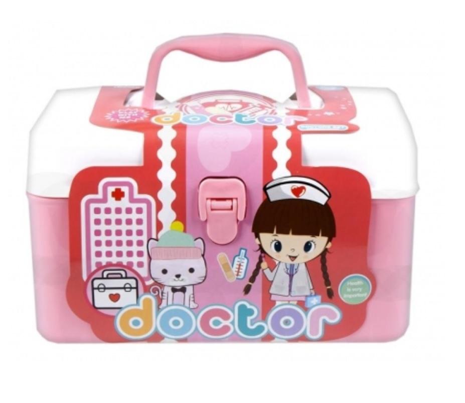 Wieloelementowy zestaw małego lekarza zamknięty w poręczną skrzyneczkę.