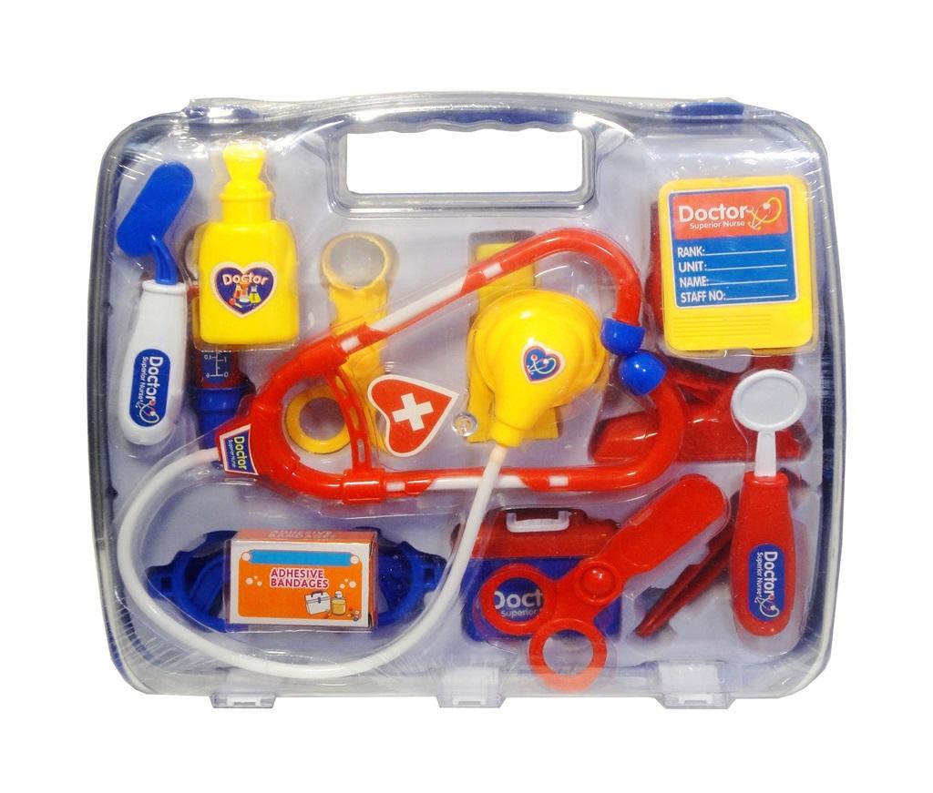 Zestaw akcesoriów dla małego lekarza. W zestawie m.in. słuchawki lekarskie, strzykawka, leki, nożyce, okulary, mały mikroskop, karta pacjenta. Podane wymiary są wymiarami opakowania. Zabawka przeznaczona dla dzieci od 3 lat.