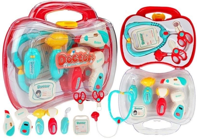 Zestaw Lekarski w Walizce Doktor Lekarz Zabawa w lekarza jest świetnym sposobem zarówno na to, by dziecko poprzez zabawę mogło opanować podstawowe elementy pomocy, ułatwiające ratowanie życia ludzi, jak i rewelacyjną metodą wyzbycia się lęku przed wizytami u lekarza. Ten wieloelementowy zestaw składa się z wszystkich narzędzi, które konieczne są w pracy lekarza. Zabawka utrzymana jest w delikatnej kolorystyce, składającej się z pastelowych kolorów, dzięki czemu będzie świetnym przedmiotem dla malucha marzącego o karierze lekarza w przyszłości. Wszelkie elementy znajdujące się w walizeczce posiadają różnorodne funkcje, bardzo urozmaicające zabawę - należy przesunąć przełącznik znajdujący się w bocznej części zabawki, na przykład w termometrze lub ciśnieniomierzu, by móc je poznać. W lusterku również znajduję się świecąca dioda. Zestaw lekarski zapakowany w walizkę zawiera: - wziernik - lusterko - termometr - młoteczek - ciśnieniomierz - nożyczki - stetoskop - karta pacjenta, identyfikator Przedstawione narzędzia medyczne są doskonałym odwzorowaniem i imitacją prawdziwych przyrządów, którym nadano lekkie, opływowe, przyjazne dla dzieci kształty. Materiały, jakich użyto do wyprodukowania zabawki, są bardzo solidne i nietoksyczne, dzięki czemu zestaw posiada certyfikat CE. Prezentowany przedmiot jest świetnym prezentem dla przyszłych lekarek, które już teraz uwielbiają zabawę w lekarza. Jesteśmy pewni, że sprawi on mnóstwo radości każdemu maluchowi, który będzie mógł leczyć swoich podopiecznych w domowym ośrodku zdrowia. Wymiary walizki: 28 cm x 26 cm x 9 cm