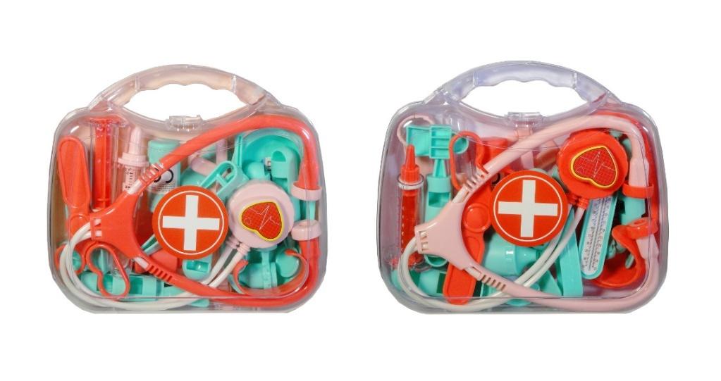 Zestaw lekarski dla dzieci zapakowany w plastikową walizkę. W zestawie znajduje się : stetoskop, termometr, lusterko, strzykawka, młoteczek, pęseta. Zabawka przeznaczona dla dzieci od 3 lat. Podane wymiary stanowią wymiar opakowania.