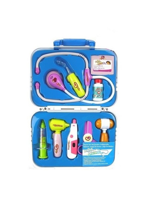 Zestaw jest doskonałą zabawką edukacyjną rozwijającą sprawność manualną naszej pociechy. Jest to fantastyczny zestaw dla małego medyka. Bogate, 9-cio elementowe, wyposażenie daje nieograniczone możliwości w leczeniu małych pacjentów. Poszczególne elementy zestawu są imitacjami prawdziwych przyrządów lekarskich, którym nadano przyjazne kształty i żywe kolory. W skład wchodzą: - strzykawka, - wziernik z lampką, - termometr wyświetlający wysoką gorączkę (z możliwością regulacji wyświetlanej temperatury), - nożyczki, - młoteczek, - lekarskie lustereczko z podświetlającą lampką, - stetoskop wydający dźwięk bijącego serduszka, - pojemniczek na lekarstwa, - plakietka lekarza rodzinnego, - walizka. Zgromadzone w zestawie przedmioty zapewnią naszej pociesze wiele radości w leczeniu najbliższych, równocześnie poprzez zabawę zniosą lęk przed prawdziwym lekarzem. Kolorowa forma instrumentów lekarskich oraz dźwięki wydawane przez niektóre z nich sprawiają, że są one bardziej przyjazne naszym maluchom. Dla dzieci w wieku od 3 lat.