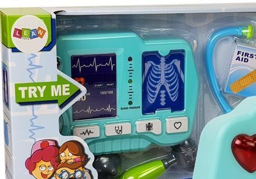 Zestaw Lekarski Aparatura Akcesoria Medyczne RTG Doktor Zestaw małego lekarza to coś, co każdy maluch powinien mieć, który interesuje się i chciałbym zostać w przyszłości lekarzem. Maluch odkryje tajniki życia lekarskiego. Nauka przez zabawę to ważny element rozwoju każdego dziecka. To idealny zestaw, aby uleczyć schorowanego misia, lub lalkę, ale też pokonać strach przed wizytą u doktora. Większość małych dzieci boi się, a dzięki zestawowi i oswojeniu się ze sprzętami medycznymi może go pokonać. Poszczególne elementy są imitacją prawdziwych przyrządów lekarskich, którym nadano przyjazne kształty i żywe kolory. Całość zestawu jest utrzymana w kolorystyce szaro- zielonej, natomiast aparatura ma kolor turkusowy. Całość wykonana z plastiku. Aparat posiada efekty dźwiękowe i świetlne. Podczas naciskania przycisków dioda świeci się na czerwono. Możemy usłyszeć także dźwięki pikające aparatury kontrolującej bicie serca, dźwięk podczas mierzenia ciśnienia krwi. Włączając przycisk RTG, zdjęcie podświetli się i usłyszymy charakterystyczne pikanie. Naciskając serduszko, usłyszymy bicie serca. Jedna aparatura, dużo możliwości zabawy. Maluch poczuje się jak profesjonalny lekarz i na pewno zachęci Cię do zabawy. Elementy zestawu: - aparatura - 4 zdjęcia RTG - stetoskop - młoteczek chirurgiczny - wziernik - 2 atrapy lekarstw Wymiary zestawu: - aparatura ok. 23 cm x 15,5 cm x 4,5 cm, - elementy (średnie wymiary) ok. 11 cm, Wymiary opakowania: 45 cm x 27 cm x 8,5 cm Ze względu na małe elementy zestaw przeznaczony jest dla dzieci powyżej 3 roku życia. Zabawka zawiera 3 baterie 1,5 V AA. Zgodne z normą EN71 oraz certyfikatem CE.