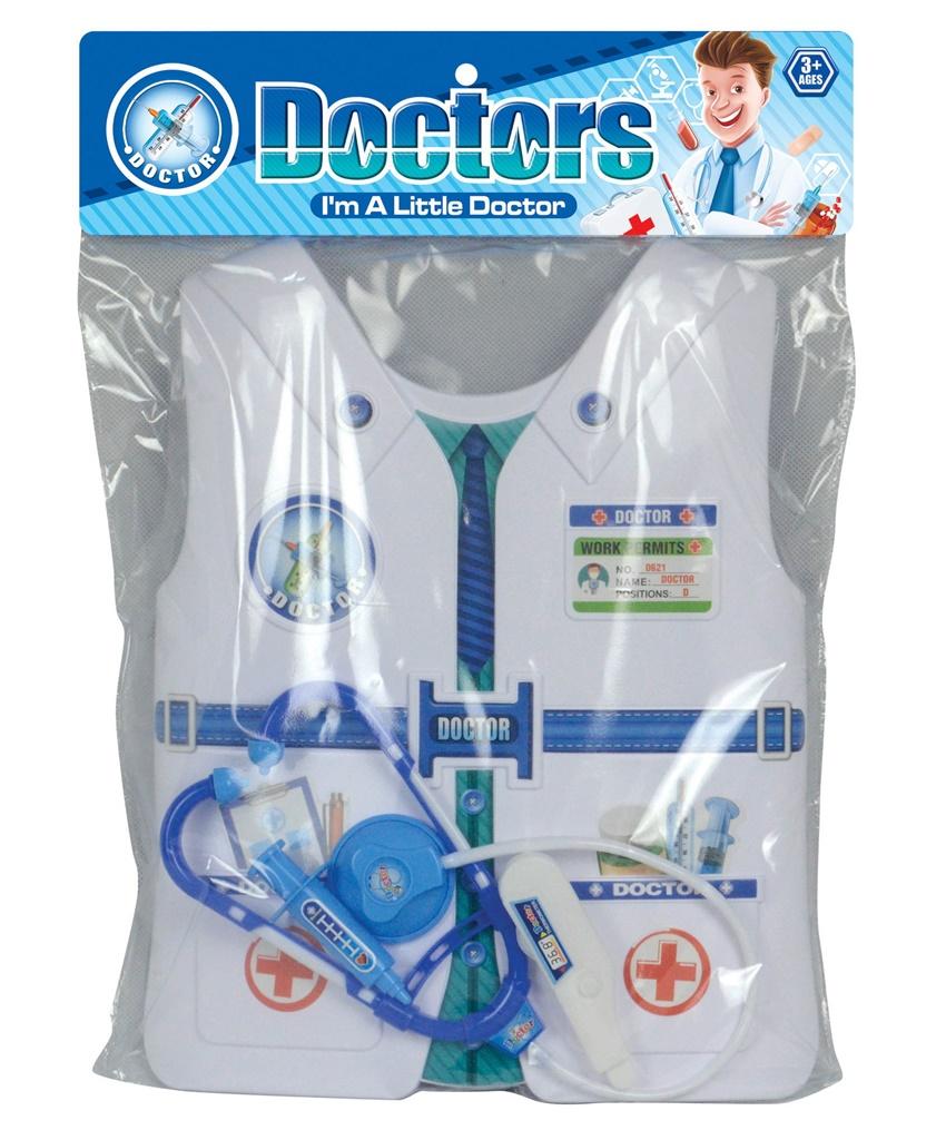 Fartuch-nowość w zestawach lekarskich oraz klasyczne przyrządy lekarskie takie jak stetoskop. Świetna zabawa, nauka i oswojenie się z lekarzem.