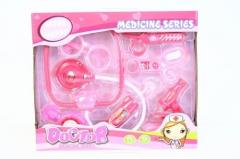 Zestaw lekarski dla dziewczynki. W skład zestawu wchodzą: stetoskop, nożyczki, otoskop, lusterko dentystyczne, szczypce, mikroskop, okulary oraz ciśnieniomierz. Lusterko dentystyczne posiada funkcje świetlne, które po naciśnięciu odpowiedniego przycisku umiejscowionego na rączce, włączają zmienne kolorystycznie światełka. Stetoskop posiada funkcje dźwiękowe oraz świetlne. Po dociśnięciu przyrządu do innej powierzchni słychać imitujące bicie serca odgłosy, którym towarzyszy migające światełko.