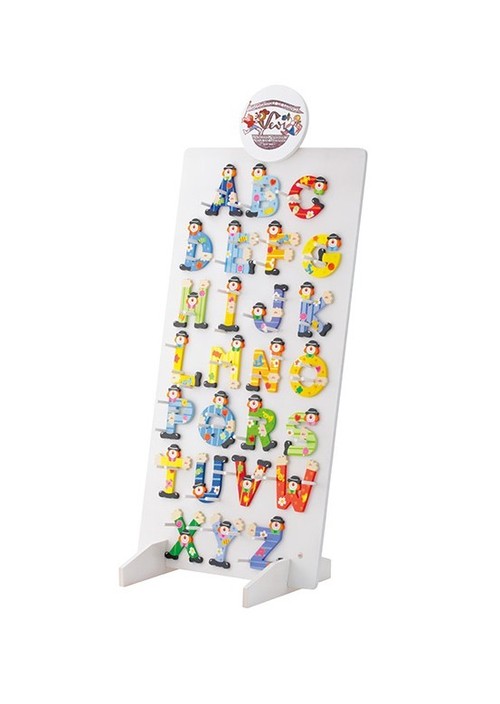 Zestaw kolorowych drewnianych literek w kształcie klaunów. Nie zawiera prezentera.