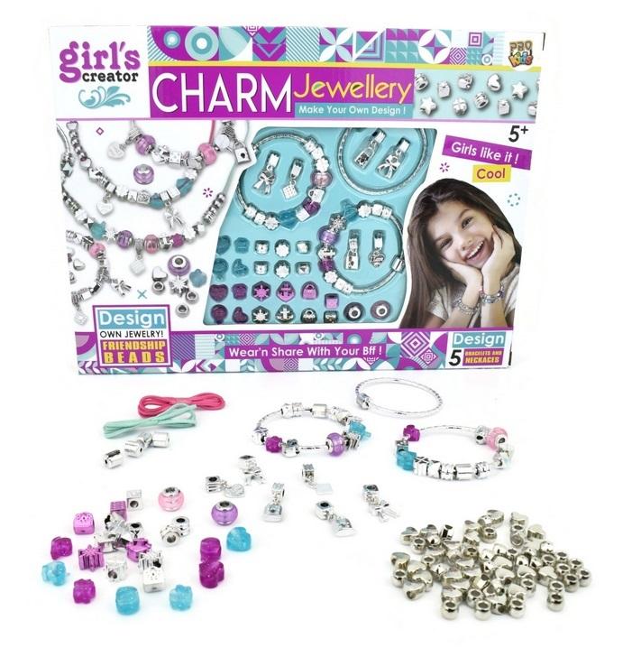 Kreatywny zestaw, w prosty i przyjemny sposób stworzymy unikalną i kolorową bransoletkę. Wiele możliwości tworzenia kreatywnych zestawów. Zestaw składa się z bransoletki oraz unikalnych koralików z różnymi motywami. W zestawie mamy trzy bransoletki oraz dwa naszyjniki, więc każdą z nich można nosić na inną okazje lub obdarować bliskie osoby. Zabawka rozwija wyobraźnię i kreatywność.