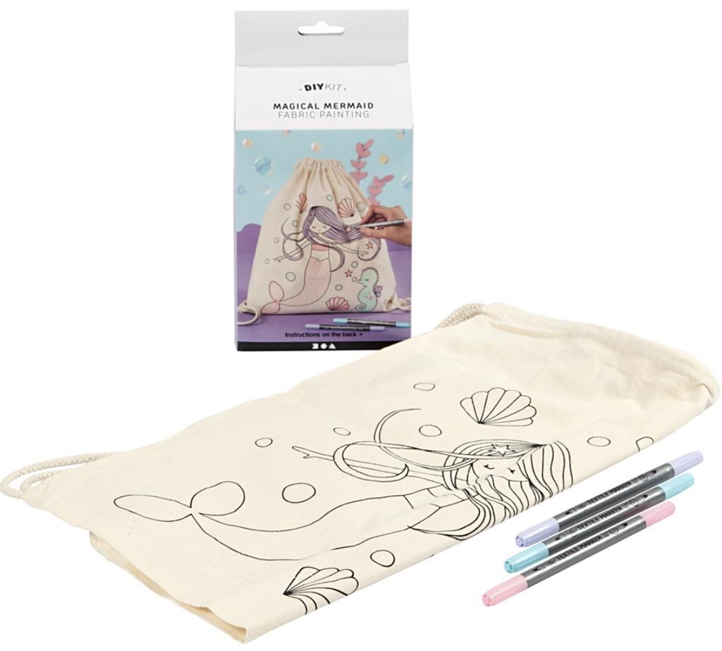 Zestaw z plecakiem / torbą gimnastyczną wykonaną w 100% z bawełny z nadrukowanym motywem oraz markerami do pomalowania tkaniny.