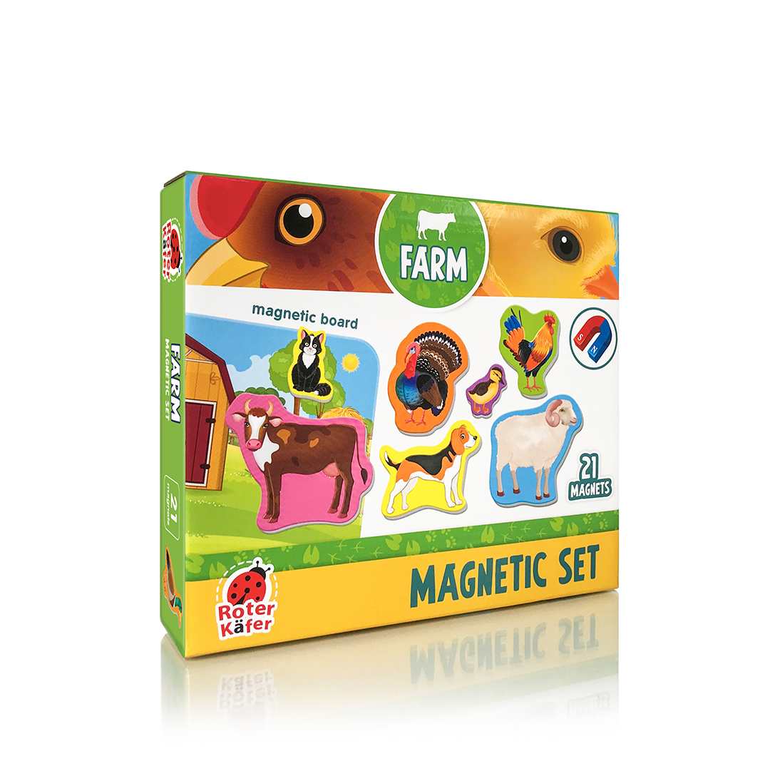Zwierzęta na farmie bywają takie różne! Chcecie dowiedzieć się o nich więcej? Zestaw magnesw zapozna dziecko z różnymi zwierzętami. Uczycie się ich nazw, dowiadujcie się, co one jedzą i jak mówią, zapamiętujcie ich właściwości. W zestawie także jest magnetyczna tablica z obrazem malowniczego pejzażu. Grać można jak na specjalnej tablicy, tak i na dowolnej innej magnetycznej powierzchni. Gra rozwija logikę, wyobraźnię, pamięć i drobną motorykę. Zestaw: 19 magnesw, tablica magnetyczna