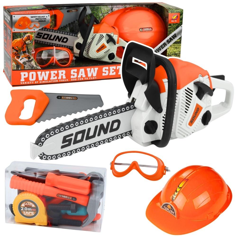 Centralnym elementem zestawu jest zabawkowa piła łańcuchowa wyposażona w efekty dźwiękowe oraz bezpieczne, obracające się ostrze, które realistycznie imituje działanie prawdziwego narzędzia. Dodatkowo pociągany rozrusznik oraz przycisk uruchamiający sprawiają, że zabawa staje się jeszcze bardziej dynamiczna i atrakcyjna dla dziecka. Całość uzupełniają akcesoria ochronne, takie jak kask, okulary oraz narzędzia, które nie tylko wzbogacają zabawę, ale również uczą podstawowych zasad bezpieczeństwa podczas pracy.
