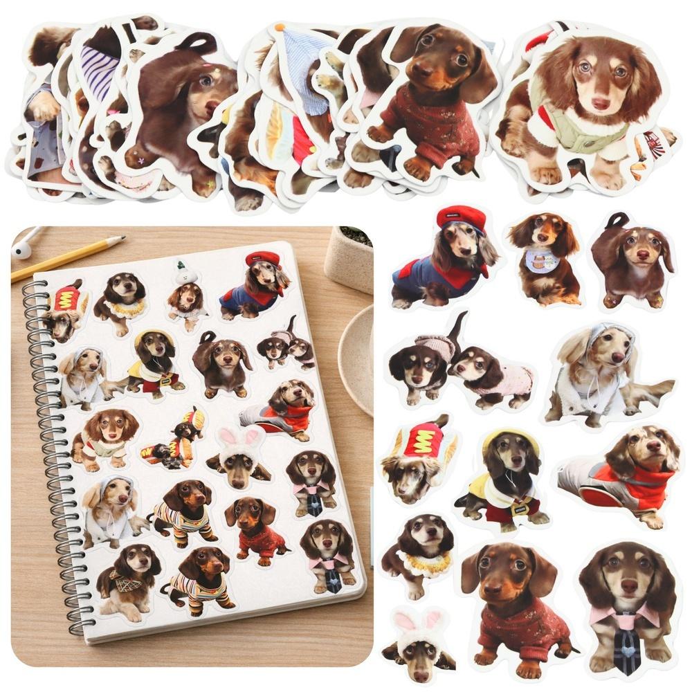 Zestaw 50 papierowych naklejek z uroczymi pieskami w typie spaniela to doskonała propozycja dla miłośników zwierząt. Grafiki przedstawiają słodkie pieski o dużych oczach i długich uszach, przypominające rasę spaniel, w różnych zabawnych i stylowych motywach. Pieski występują w ubrankach, czapkach, kostiumach oraz w naturalnych, sympatycznych pozach.