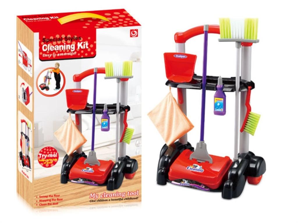 Zestaw małej sprzątaczki który zawiera jeżdżący stojak na akcesoria do sprzątania takie jak, łopatkę, zmiotki, szmatkę oraz inne.