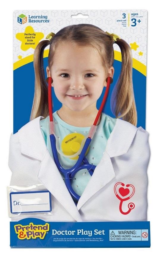 Zestaw zawiera: Fartuch lekarza, Stetoskop, Plakietkę do personalizacji. Fartuch ma dwa duże zatrzaski do zapinania. Fartuch pasuje dla większości dzieci w wieku 3-6 lat.