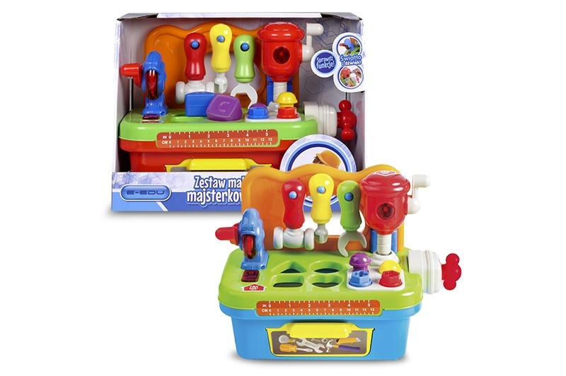 Zestaw małego majsterkowicza z funkcjami takimi jak światło, dźwięk, ruchome elementy. W skład zestawu wchodzą: skrzynka z sorterem kształtów, śrubokręt, młotek, klucz do przykręcania, klocki do sortera, piła tarczowa, wiertarka, imadło, śrubki i gwoździe.