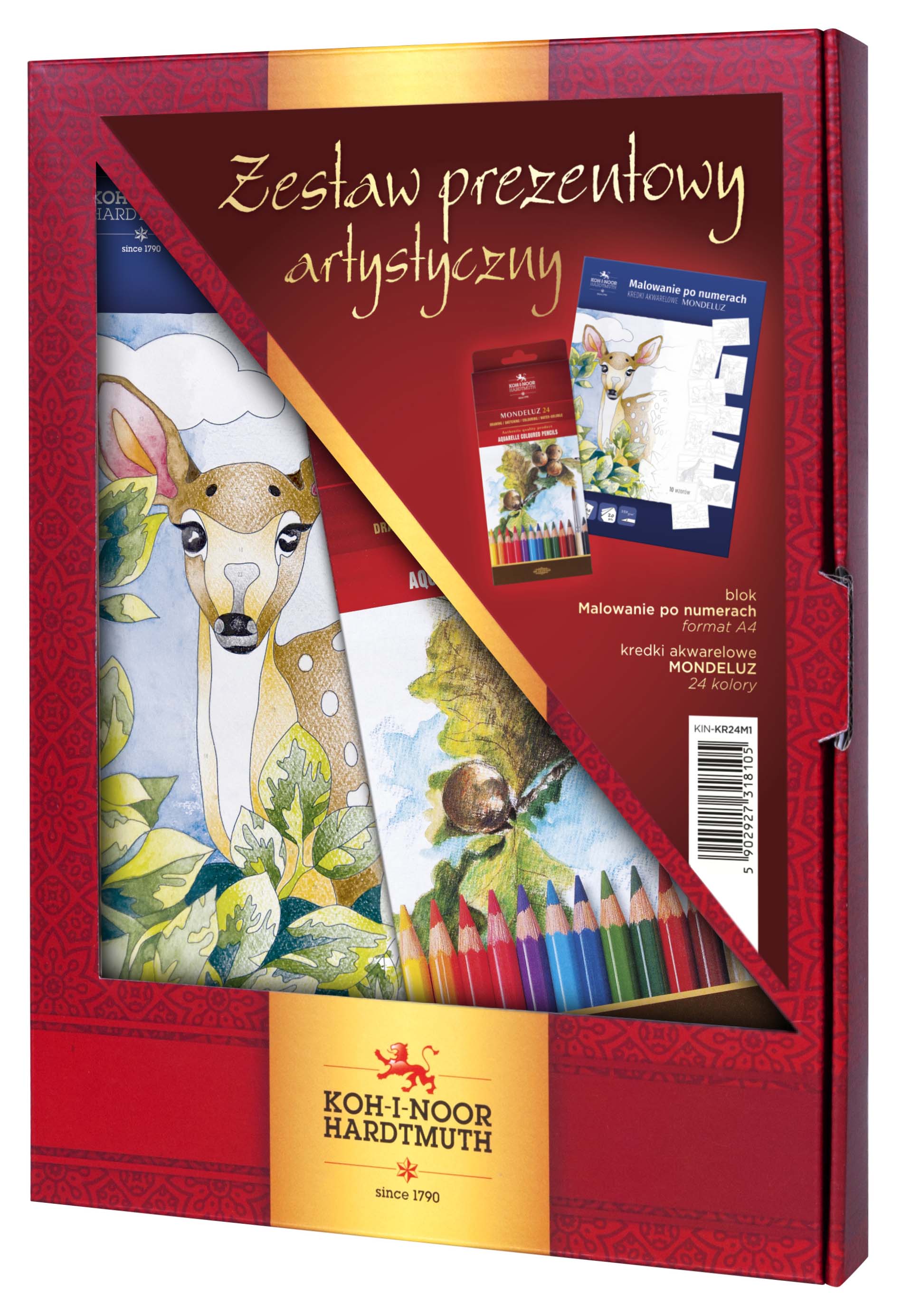 W skład zestawu wchodzą: Malowanie po numerach oraz zestaw kredek akwarelowych Mondeluz 24 kolory.