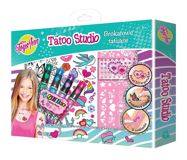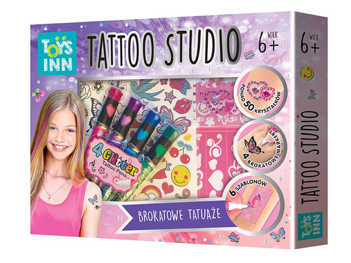 Zestaw pozwala na tworzenie własnych, unikalnych tatuaży. Do wykorzystania są brokatowe tatuaże, szablony, jednobarwne tatuaże, które można pokolorować dołączonymi brokatowymi markerami. Gotowe tatuaże, można ozdobić przyklejanymi kryształkami. Zestaw rozwija kreatywność dzieci, poprzez możliwość tworzenia własnych oryginalnych wzorów. W komplecie znajdują się: 4 brokatowe markery do tatuaży (zielony, niebieski, fioletowy, różowy), 6 szablonów wielokrotnego użytku, 24 brokatowe tatuaże, 27 jednobarwnych tatuaży, 57 samoprzylepnych kryształków w różnych kolorach. Zestaw od 6 roku życia.