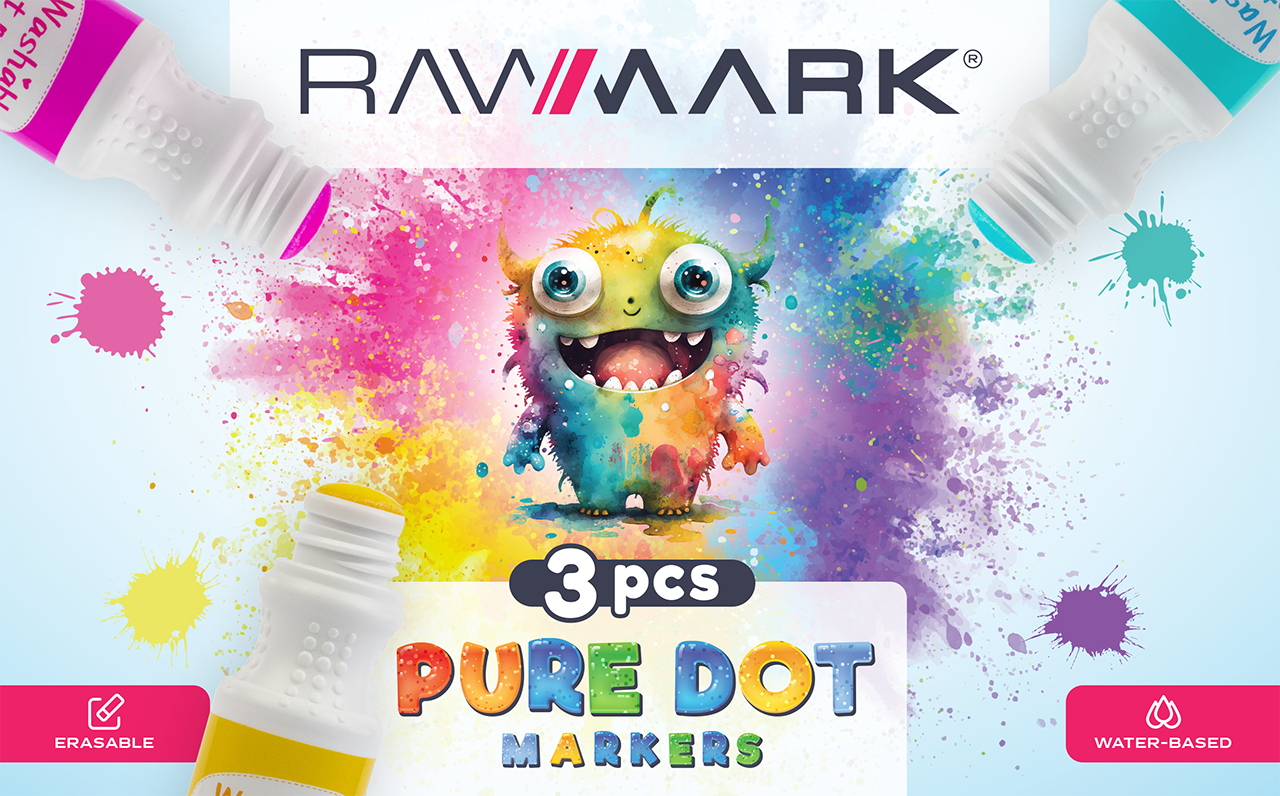 Markery Pure Dot to farba w płynie w dużej, dopasowanej do rąk dziecka butelce, zakończonej dużą, miękką gąbeczką, która nie wysycha i zawsze pozostawia na kartce idealną kropkę. Do malowania, kolorowania, nauki, do tworzenia arcydzieł kropka po kropce.