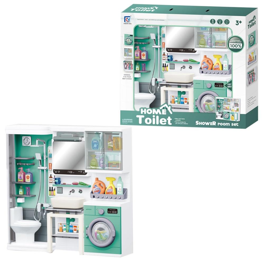 Zestaw mebli łazienkowych składa się z jednego elementu z pralką, drugiego z umywalką i trzeciego z toaletą i prysznicem. W zestawie znajdują się również akcesoria łazienkowe oraz górne szafki. Efekty dźwiękowe i świetlne. Wymagane baterie - 3xAA oraz 1xAAA (niedołączone).