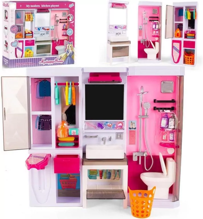 Stylowy i kolorowy zestaw łazienkowy do domku dla lalek to idealna propozycja dla każdej małej miłośniczki zabawy w dom. W komplecie znajdują się realistyczne meble i akcesoria: prysznic, toaleta, umywalka z lustrem, pralka, szafki oraz półki z kosmetykami. Całość wykonana została z trwałego plastiku i dopracowana w najmniejszych szczegółach. Dzięki bogatemu wyposażeniu dziecko może odgrywać codzienne scenki, rozwijając przy tym wyobraźnię, kreatywność i umiejętności społeczne. Zestaw pasuje do większości popularnych domków dla lalek i może być uzupełnieniem innych pomieszczeń. To świetny pomysł na prezent, który zapewni godziny wesołej i edukacyjnej zabawy.
