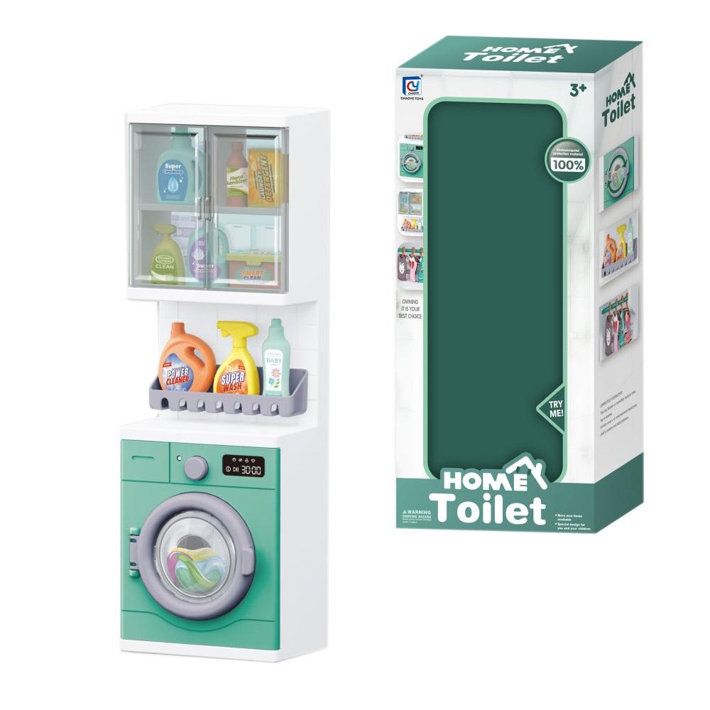 Zestaw łazienkowy z pralką, górnymi szafkami i drobnymi akcesoriami. Dźwięk i światło. Wymagane baterie - 3xAA (niedołączone). Wymiary opakowania: 15.5 x 8 x 36 cm