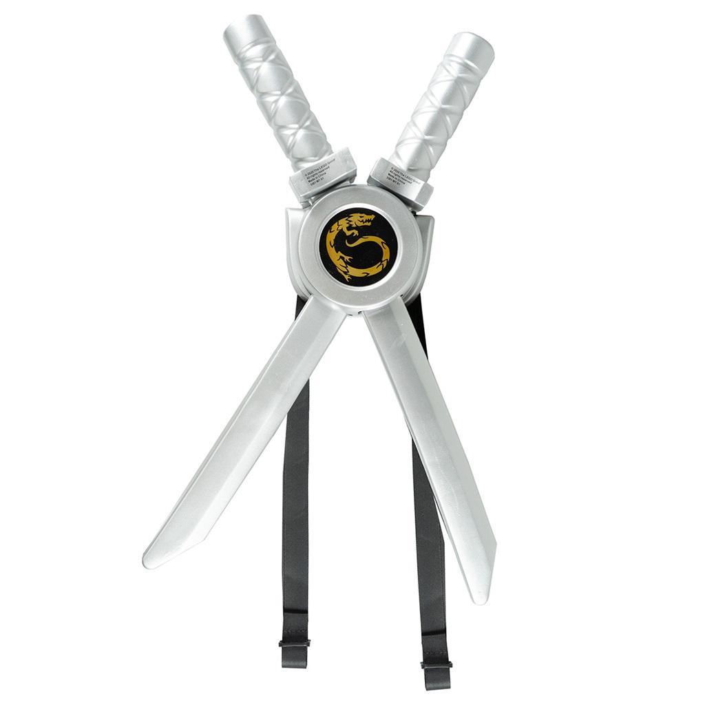 Zestaw dwóch mieczy Ninjago w kolorze srebrnym, wykonane z tworzywa sztucznego. Możliwość noszenia mieczy na plecach. Do zestawu dołączono kaburę na szelkach mieszczącą dwa miecze. Oryginalny produkt licencjonowany. Element kostiumu Ninjago lub osobne akcesorium na zabawy karnawałowe, bal przebierańców, przyjęcie urodzinowe.