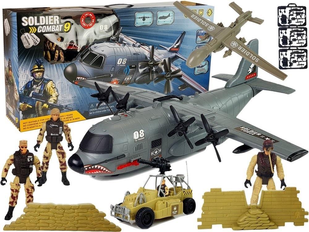 Zestaw Militarny Ogromny Samolot Wojskowy 87 cm z Dźwiękami Światłami Akcesoria Wojskowe Prezentowany zestaw militarny jest rewelacyjną propozycją zabawki dla wszystkich małych chłopców, którzy uwielbiają bawić się w żołnierzy i wojskowych. Dzięki elementom wchodzącym w skład zestawu dziecko będzie mogło w zabawie odgrywać rolę pilota ogromnego, wojskowego samolotu, jak i pozostałych członków załogi. Elementy te stanowią doskonałe urozmaicenie zabawy, ponieważ można połączyć je z innymi zabawkami, które fan wojska ma już w swej kolekcji. Zestaw z serii militarnej został wykonany z atestowanego, solidnego materiału, jakim jest plastik. Kolorystyka samolotu urozmaicona wzorami moro doskonale nawiązuje do wojskowych barw, co sprawia, że zabawka wygląda bardzo realnie. Samolot odznacza się bardzo dużym rozmiarem - rozpiętość jego skrzydeł to aż 87 cm, natomiast długość - 78 cm. W konstrukcji samolotu uwzględnione ruchome i otwierane elementy. Śmigła znajdujące się na skrzydłach samolotu, są obrotowe, tak samo, jak potrójna broń wystająca z okien maszyny. Na dachu samolotu umieszczone są dwa guziczki, których wciśnięcie uruchamia efekty świetlne i dźwiękowe, czyniące zabawę jeszcze lepszą frajdą! Odgłosy startowania i lądowania umożliwią bardziej realistyczne odczucia, a dźwięki strzału sprawiają, że zabawa jest jeszcze lepsza. Rozpocznij zabawę i stwórz własne pole bitwy! Elementy zestawu: - duży samolot, - samochód z wyrzutnią - mały samolot odrzutowy z wyrzutnią - zestaw broni - 2 rakiety - mury obronne -3 żołnierzy Wymiary elementów zabawki: - samolot: 78 cm x 87 cm x 27 cm - żołnierz: 10, 5 cm wysokości - auto wojskowe: 23 cm x 10,5 cm x 17 cm - mały odrzutowiec: 13,5 cm x 20 cm x 3 cm Wymiary opakowania zestawu: 87 cm x 42 cm x 17 cm Przeznaczony dla wszystkich dzieciaków powyżej 3. roku życia. Zabawka zasilana jest dwoma AG13. posiada certyfikat CE, gwarantujące komfort i bezpieczeństwo płynące z jej użytkowania.