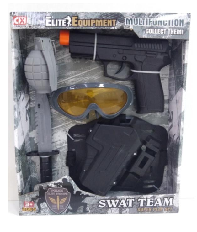 Wieloelemtnowy zestaw militarny z funkcją światła oraz dźwięku, zawiera takie elementy jak: pistolet, okulary, kabura, nóż oraz granat