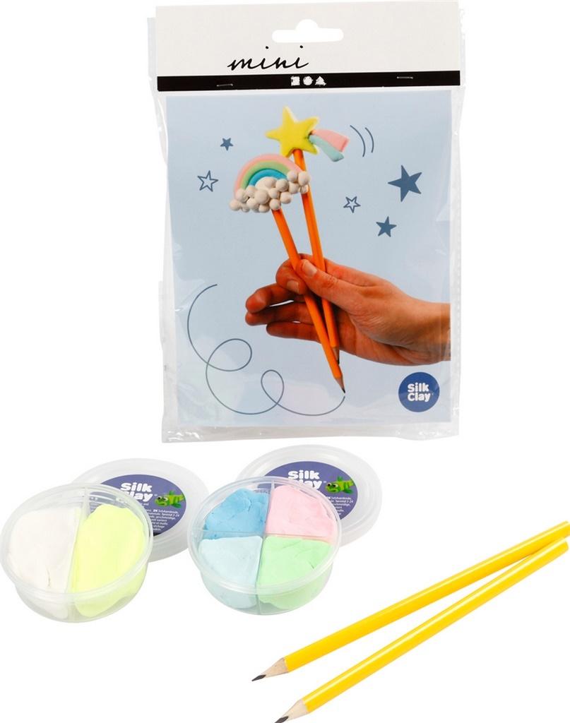 Zestaw materiałów do dekoracji ołówków z jedwabistą masą plastyczną. Zawartość: 2 ołówki i jedwabistą masą plastyczna w 6 kolorach.