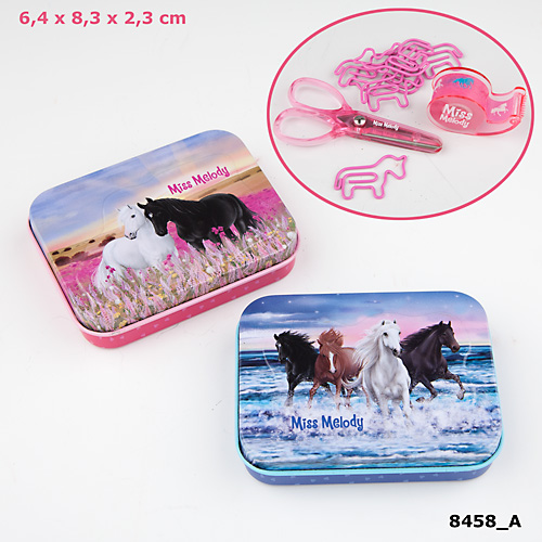 ZESTAW MINI PAPIERNICZY Miss Melody. Zestaw artykułów biurowych w metalowym pudełku z tłoczoną pokrywką. W zestawie: nożyczki, spinacze w kształcie koników, taśma klejąca z motywem koników.