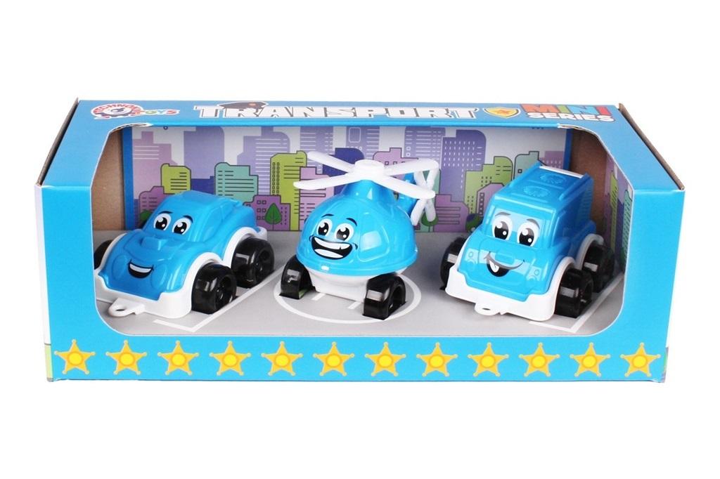 Zestaw zawiera samochód, minibus i śmigłowiec.