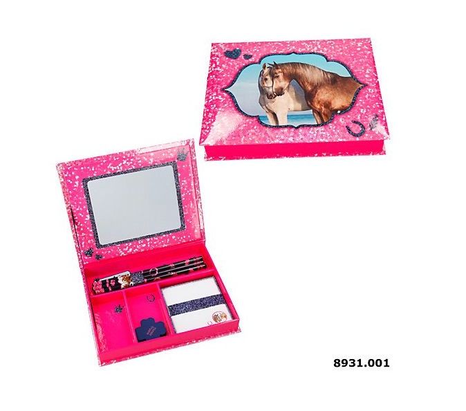 Zestaw na biurko, brokatowy z lusterkiem.Wzór z konikami.W zestawie: 3 ołówki, gumka, karteczki notesowe oraz 25 spinaczy do papieru.