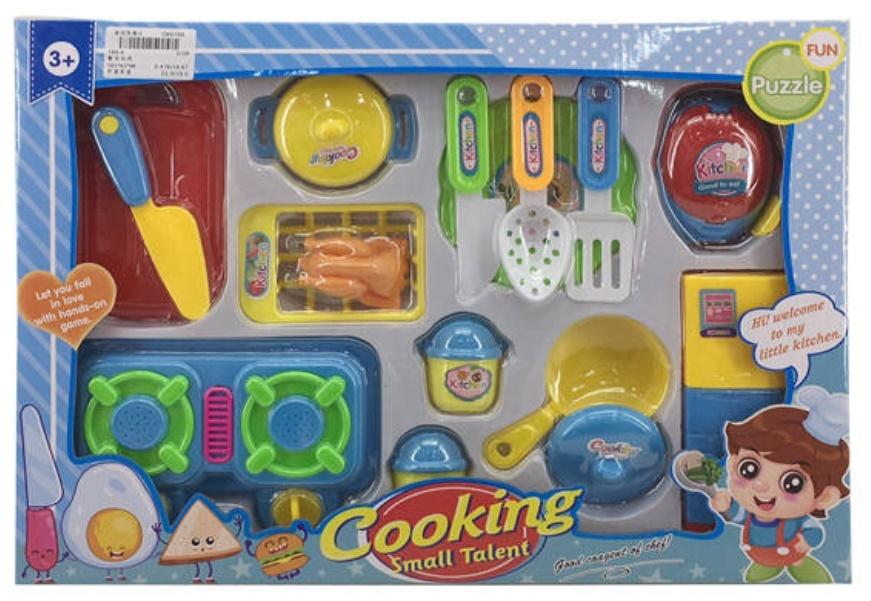 Zestaw naczyń, który zawiera: kuchenkę, deskę do krojenia, nóż, garnek, patelnię, artykuły spożywcze. Produkt nie potrzebuje baterii. Zabawka przeznaczona dla dzieci powyżej 3 roku życia.