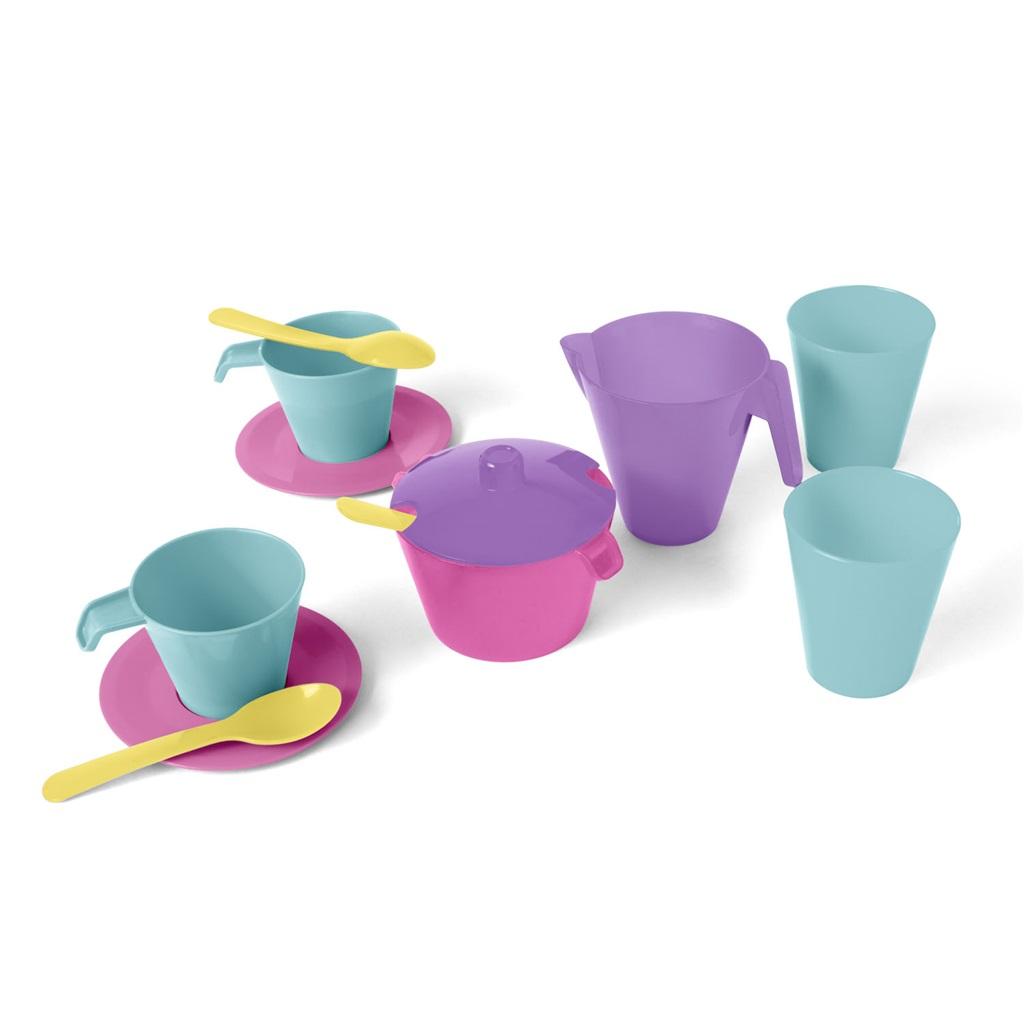 Zestaw naczyń Party Time spodoba się każdemu miłośnikowi zabaw w gotowanie i organizowanie przyjęć i będzie doskonałym uzupełnieniem dziecięcej kuchni. Zestaw składa się z 12 elementów: dzbanka, cukiernicy z pokrywką, 2 kubków, 2 filiżanek, 2 spodeczków i 3 łyżeczek. Poszczególne elementy zestawu są w kolorze różowym, fioletowym i miętowym. Całość jest starannie wykończona i bezpieczna w użytkowaniu - naczynia są dopuszczone do kontaktu z żywnością, można używać ich w kuchence mikrofalowej i myć w zmywarce.