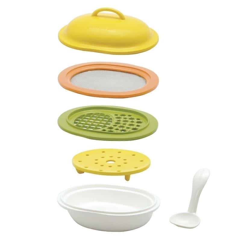 Zestaw all-in-one do przygotowania posiłków dla niemowląt. Testowany laboratoryjnie: wykonany z nietoksycznych materiałów. Uniwersalny zestaw do przygotowywania posiłków dla niemowląt, w którym znajdziesz podstawowe narzędzia, których potrzebujesz. W skład zestawu wchodzą: miska z otworami, płyta do gotowania na parze, sitko, płyta do krojenia i tarcia, łyżka kuchenna oraz pokrywka. Ten zestaw zajmuje niewiele miejsca, dzięki czemu jest idealny dla osób z małymi kuchniami.