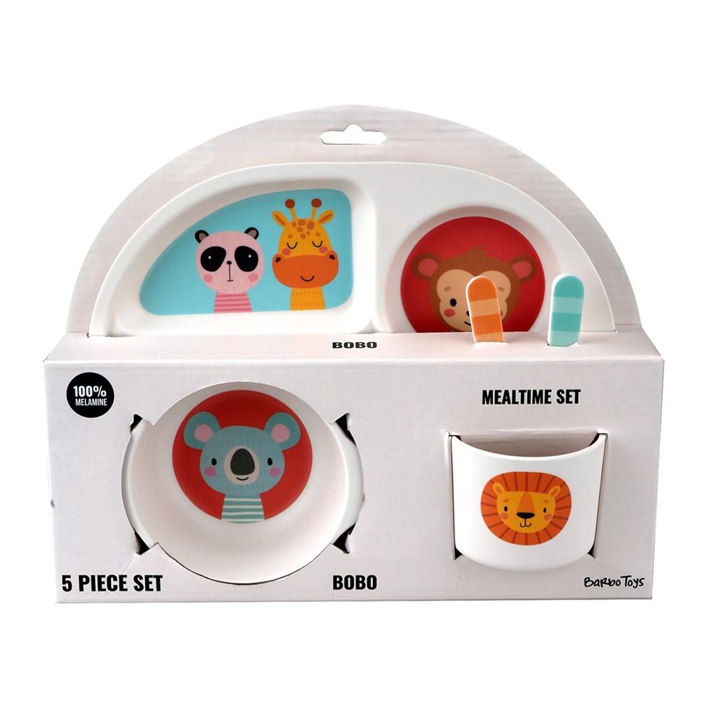 Zestaw Naczyń Dziecięcych z Melaminy, 5 el., Bobo Uroczy zestaw obiadowy z melaminy z wizerunkami wesołych zwierząt sprawi, że każdy posiłek będzie dużo przyjemniejszy dla dzieci. Zestaw składa się z 4-komorowego talerzyka, miski, kubka oraz łyżeczki i widelca. Ten zestaw do jedzenia to idealny początek, gdy maluch musi zacząć samodzielnie jeść. Zestaw do jadalni wykonany jest z żywicy melaminowej (bez BPA), która jest zarówno praktyczna, trwała, jak i absolutnie niezbędna do codziennego użytku. Dzieciom spodoba się posiadanie własnego zestawu do jedzenia ozdobionego uroczymi zwierzątkami. Doskonały pomysł na prezent na chrzciny, imieniny, urodziny. Szczegółowe informacje o produkcie: W zestawie: 4 - komorowy talerz, miseczka, kubek, łyżeczka i widelec. Nie zawiera BPA. Naczynia z melaminy przede wszystkim są ekologiczne, odporne na uszkodzenia, nie tłuką się, są wytrzymałe na uderzenia. Przeszły wszystkie rygorystyczne badania związane z dopuszczeniem ich do użytku dla dzieci. Są bez BPA, bez ftalanów, wyprodukowane zgodnie z obowiązującymi, europejskimi normami bezpieczeństwa. Można myć w zmywarce. Kategoria wiekowa: 1+. Wymiary opakowania: 30 cm x 25 cm x 5 cm. Uwaga: Umyć przed pierwszym użyciem, nie używać w kuchence mikrofalowej. Uwaga: Bambusowe produkty melaminowe można stosować do ciepłych posiłków (do 70 stopni Celsjusza). Produkty Barbo Toys są projektowane w Danii, ze szczególną dbałością o zrównoważony rozwój i wysokiej jakości materiały. Zabawki są wytwarzane zgodnie z filozofią "nauka przez zabawę", aktywnie wspierają i stymulują zarówno wyobraźnię jak i edukację dziecka, przy tym charakteryzują się doskonałym skandynawskim wzornictwem.