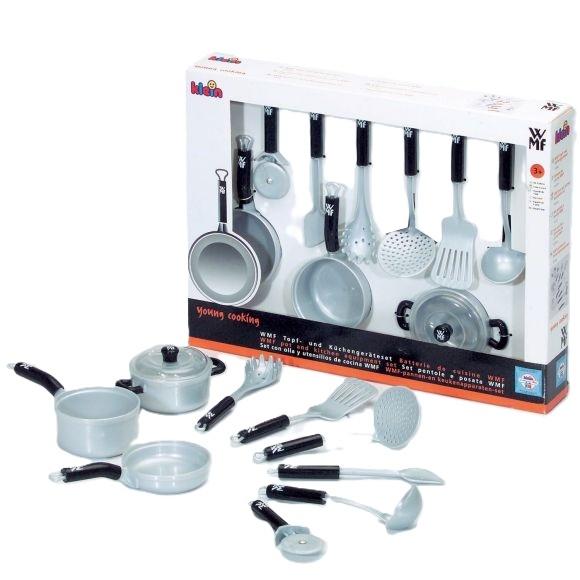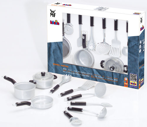 Klein 9428 Zestaw naczyń i akcesoriów kuchennych W skład zestawu wchodzą garnek z uchwytami, garnek z rączką, patelnia, pasująca do nich przezroczysta pokrywka oraz akcesoria kuchenne: nóż do krojenia pizzy, łyżka do makaronu, łopatka do obracania, łyżka z dziurkami i szpatułka. Wszystkie przyrządy są w kolorze srebrnym, a dodatkowo zdobi je logo rozpoznawalnej firmy WMF, która jest producentem wysokiej jakości akcesoriów kuchennych. Ponadto wszystkie elementy zestawu, oprócz garnka z uchwytami, posiadają wygodne rączki zakończone zawieszkami, dzięki którym z łatwością można je powiesić na haczykach. Zestaw WMF zachwyci każde dziecko, które uwielbia obserwować i pomagać swojej mamie i rodzinie w kuchni. Ich wielkość jest dopasowana do potrzeb i rączek dziecka, a dzięki plastikowym elementom są zupełnie bezpieczne podczas zabawy. Zestaw może być również świetnym uzupełnieniem pozostałych zestawów kuchennych firmy Klein. W zestawie znajdują się garnki i akcesoria kuchenne Długość przyrządów kuchennych: ok. 17 cm Średnica garnków: 8 cm Wymiary opakowania: 40 x 30 x 6 cm Zabawka od 3 roku życia