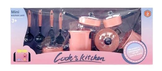 Zestaw plastikowych naczyń kuchennych (np. garnek, durszlak, rondelek) z akcesoriami. Zabawka przeznaczona dla dzieci powyżej 3 roku życia. Produkt zapakowany w kartonowe opakowanie z przezroczystym okienkiem. Podane wymiary są wymiarami opakowania.