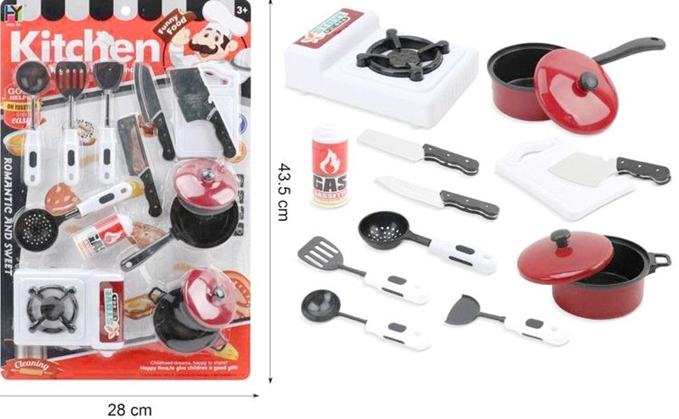 Zestaw naczyń i akcesoriów kuchennych dla małej gospodyni domowej, przydatne podczas zabawy w dom. W zestawie można znaleźć m.in.: garnek i rondelek z pokrywkami, kuchenkę, tarkę, a także akcesoria kuchenne np.: noże, łyżka, cedzak, nabierka. Produkt zapakowany w kartonową podstawkę z przezroczystym kloszem Produkt dla dzieci od 3 lat. Podane wymiary są wymiarami opakowania.