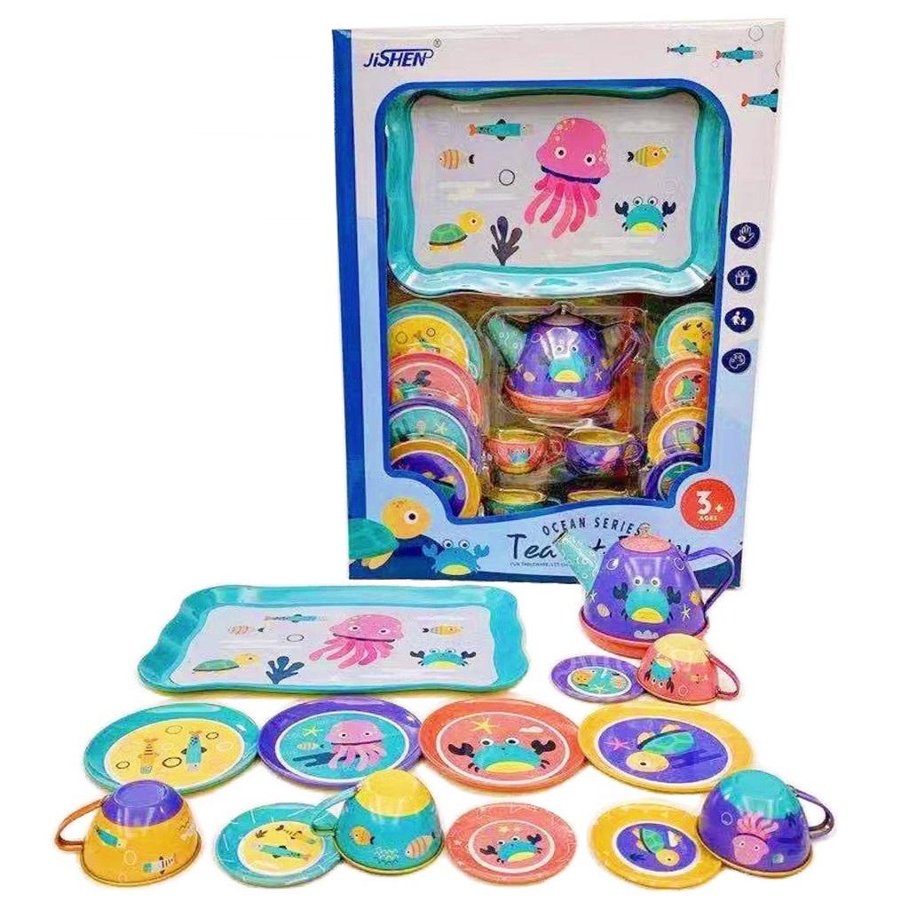 Zestaw metalowych naczyń z tacą i morskim motywem.
