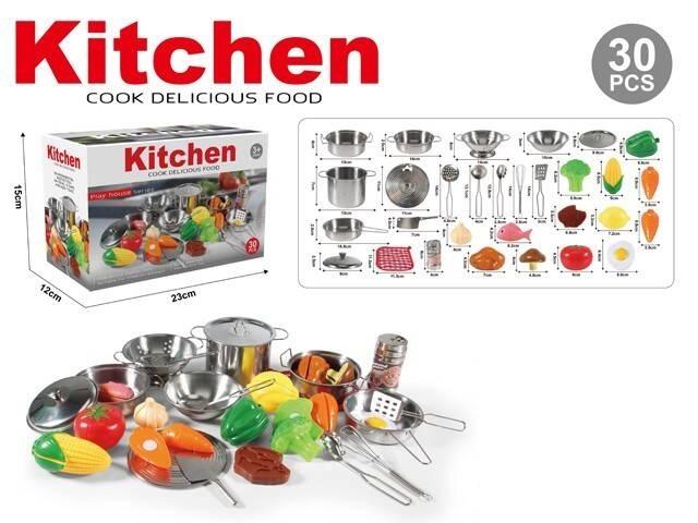 Zestaw metalowych naczyń zawierający 30 elementów. Nieodłączny element zabawy w dom, czy w gotowanie.