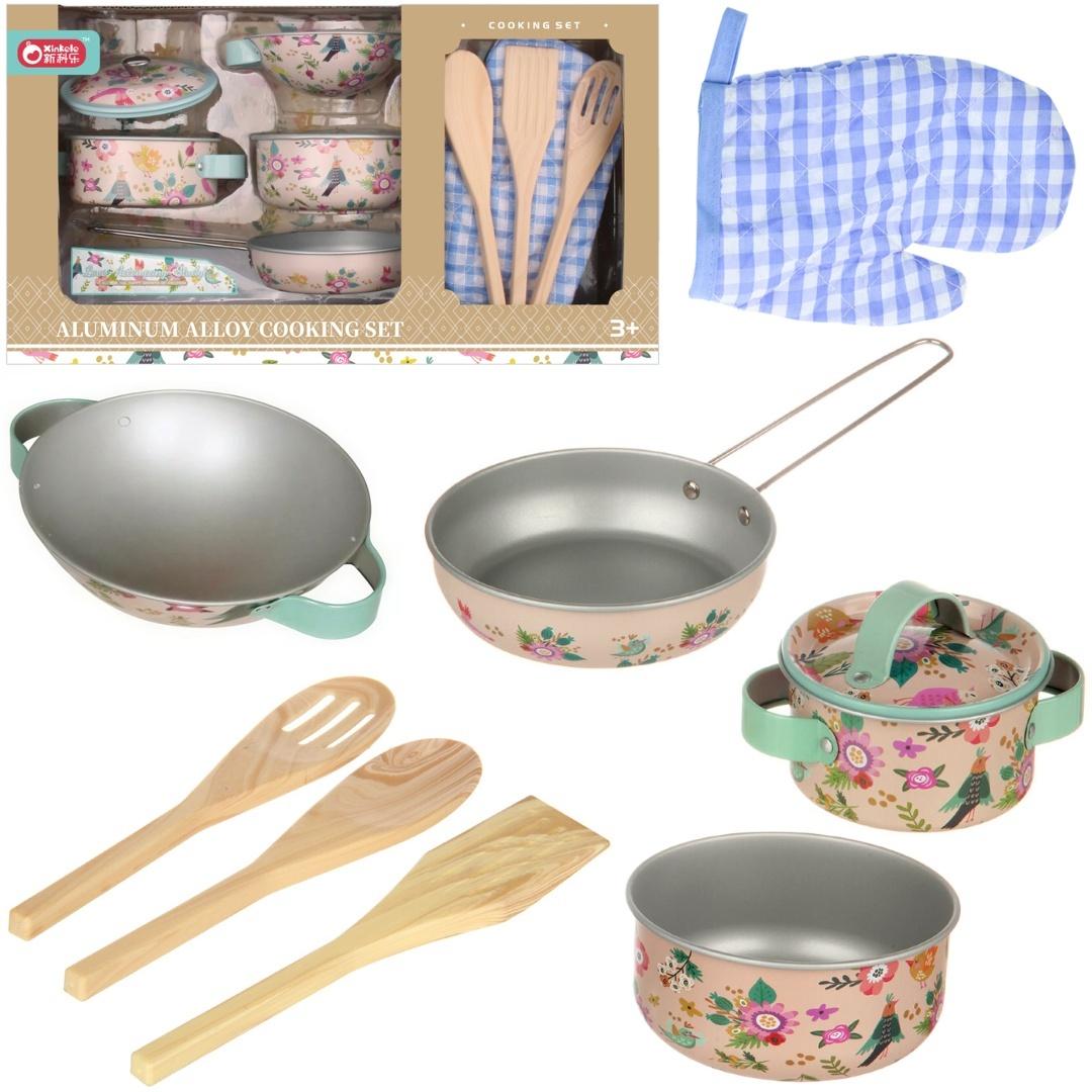 Ten wyjątkowy zestaw naczyń kuchennych wykonany ze stopu aluminium to połączenie klasycznego designu z niezwykłą trwałością. W przeciwieństwie do plastikowych zabawek, ten komplet oferuje realistyczne wrażenia z gotowania, pozwalając dzieciom poczuć się jak w prawdziwej kuchni. Piękne, kwiatowe wzory w stylu vintage sprawiają, że zestaw prezentuje się niezwykle elegancko i będzie ozdobą każdego dziecięcego kącika zabaw.