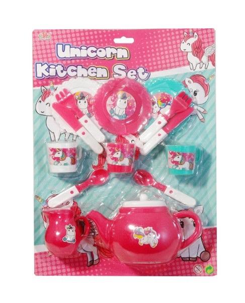 Zestaw plastikowych naczyń dla dzieci. W zestawie znajdują się: talerzyki, kubeczki, czajniczek, mlecznik i sztućce. Naczynia ozdobione są wizerunkami jednorożca. Produkt zapakowany w kartonową podstawkę z przezroczystym kloszem. Podane wymiary są wymiarami opakowania.