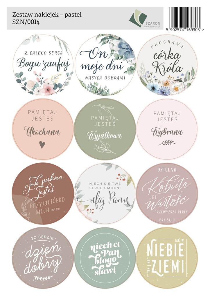 Zestaw naklejek z chrześcijańskimi hasłami w otoczeniu pastelowych barw.
