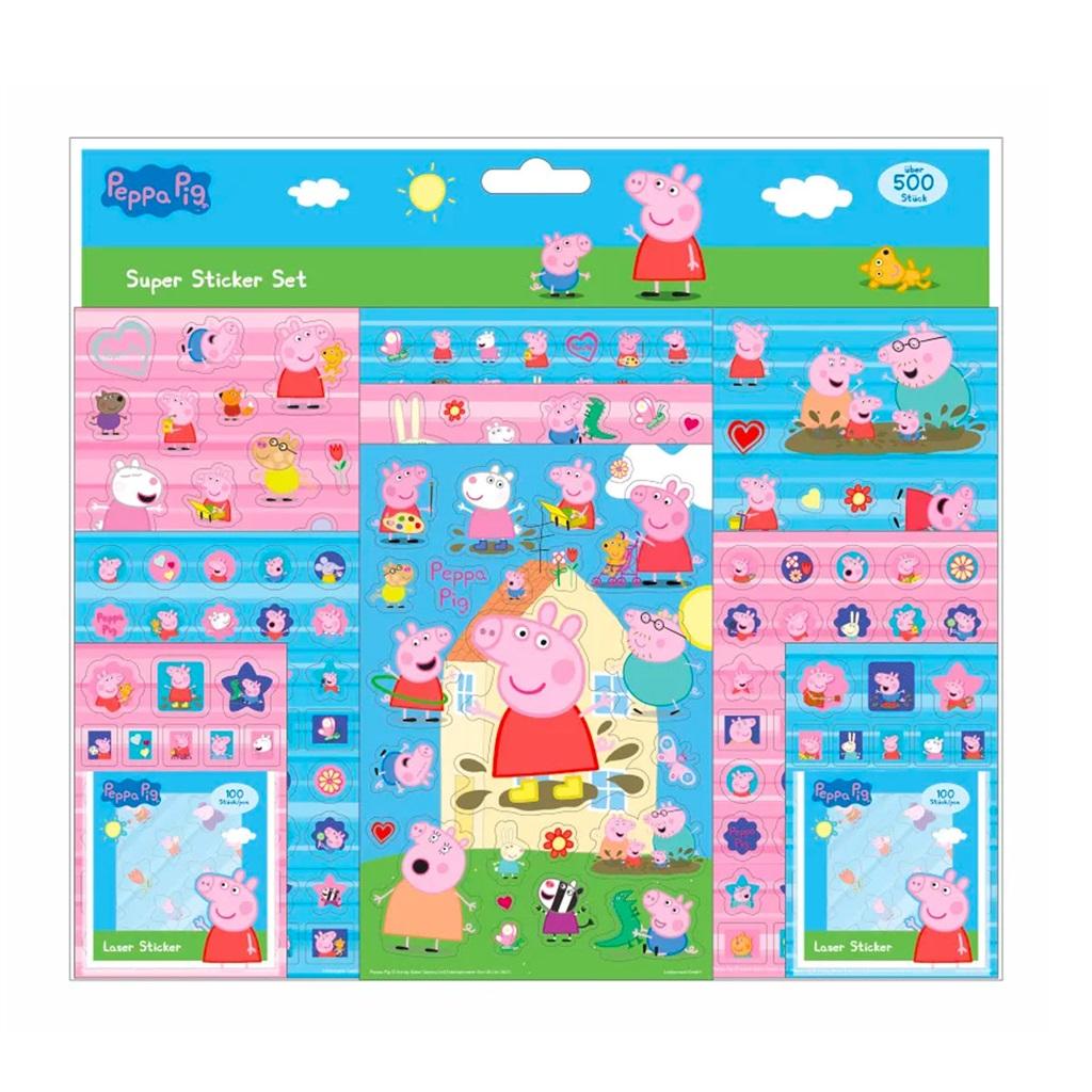 Zestaw Naklejek - Świnka Peppa - 500szt. Wymarzony zestaw, bardzo starannie wykonanych, naklejek - metalicznych, papierowych, laserowych i wypukłych - 11 arkuszy /500 szt./. Zabawa - niespodzianka. Przyklej je gdziekolwiek chcesz, np: na zeszycie, piórniku, torbie, ale też zwłaszcza laserowe - na rowerze, telefonie, lub deskorolce. Zaprojektowany na podstawie kultowego filmu Świnka Peppa, prezentuje się bardzo oryginalnie. Dzięki uroczym bohaterom niekończąca się zabawa może być fajna. Zestaw fantastycznych różnorodnych naklejek - 500 szt. Zestaw naklejek o różnym rozmiarze, z różnych materiałów Wszystkie przedstawiają ulubionych bohaterów i akcesoria z filmu Świnka Peppa. 4 arkusze naklejek metalicznych. 1 arkusz naklejek papierowych. 2 zestawy naklejek laserowych pokrytych wzorem oraz specjalną powłoką, która pod wpływem światła ukazuje mieniące się wieloma kolorami kształty. Przypominają efekt hologramu. 4 arkusze naklejek wypukłych, wielokrotnego użytku z wizerunkami bohaterów. Wymiary arkuszy: 24 cm lub 27 cm lub 30 cm x 16 cm x 0,1 cm, i wiele innych. Wymiary opakowania: 41 cm x 38 cm x 0,5 cm. Uwaga: produkt przeznaczony dla dzieci powyżej 3 lat. Ryzyko zakrztuszenia.