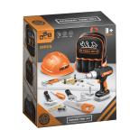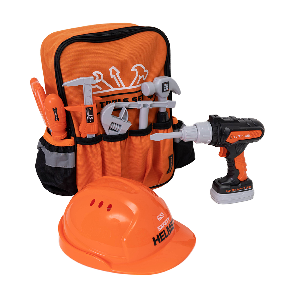 Zestaw z 28 elementów, między innymi wiertarko-wkrętarki oraz kilku wymiennych końcówek do niej, kasku, piły, młotka, śrubokrętu, miarki. Wszystko zapakowane w plecak. Wiertarko-wkrętarka wymaga baterii - 2xAA (niedołączone)
