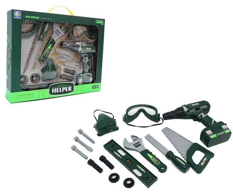wkrętarka, zestaw śrub i podkłądek, gogle, poziomnica, piła, pilnik, maseczka, klucz