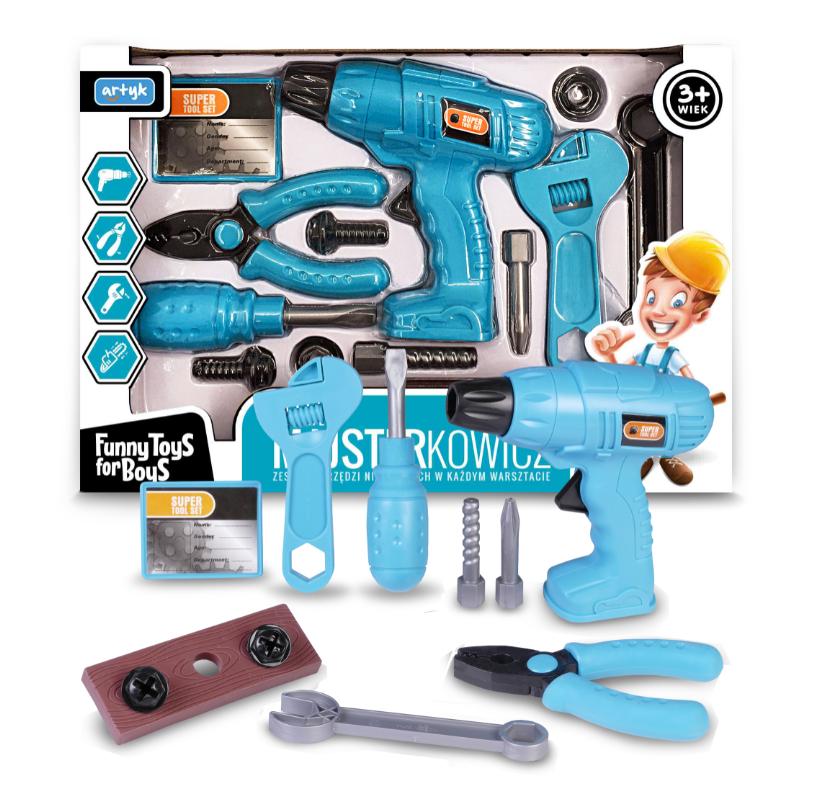 W zestawie: wkrętarka z dźwiękiem, kombinerki, śrubokręt, klucz francuski, klucz płaski, śrubki.