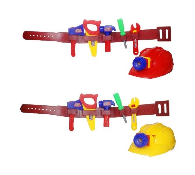 Kask wraz z narzędziami na pasku takimi jak: piła, młotek, śrubokręt, siekiera. Teraz narzędzia będą zawsze pod ręką. Podane wymiary są wymiarami produktu w opakowaniu. Produkt zapakowany w worek z siateczki. Zabawka dla dzieci od 3 lat. Wybrane elementy zestawu działają na baterie typu AA. Baterie nie są załączone do zabawki.